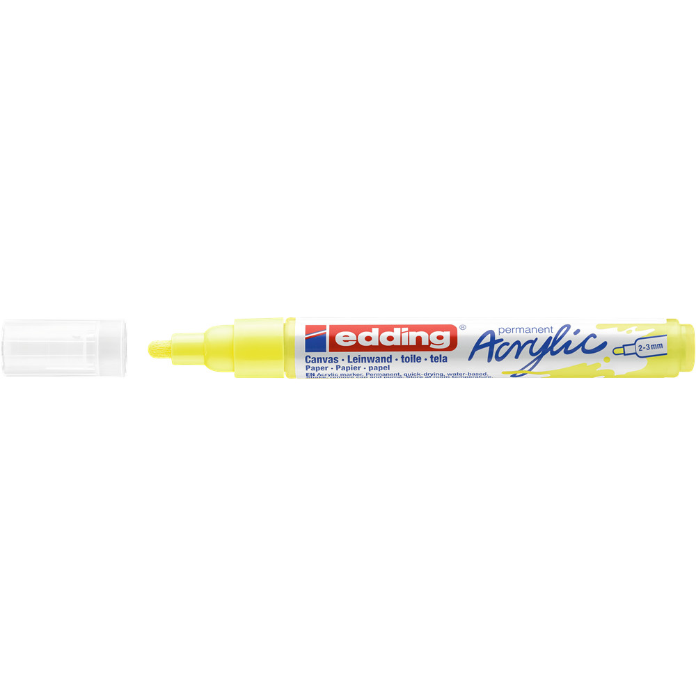 Akril marker világos vagy sötét felületekre történő festéshez, ideális olyan anyagokhoz, mint a vászon vagy a festőpapír. - A kerekített csúcs vonalvastagsága 2-3 mm. - A kiváló minőségű, pigmentált, vízbázisú akrilfesték száradás után rendkívül tartós, átlátszatlan, fényálló és szagtalan. - A neon sárga szín áttetsző. Megfelelő pótcsúcsok (edding 5100 pótcsúcsok) elérhetők.- 26 féle színválasztékban elérhető- Keresse a további változatokat - edding 5000 és az edding 5300-at, valamint az edding 5400 3D hatású 2 végű akril markereket. Katalóguskód: 36464