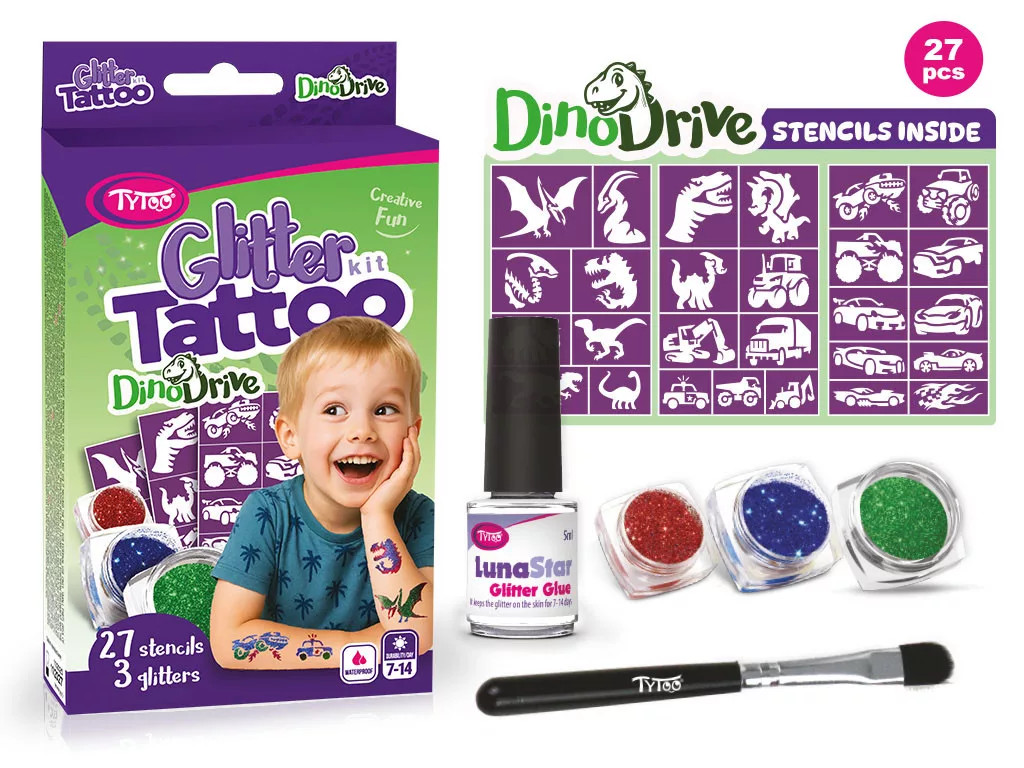 A DinoDrive Csillámtetoválás Szett a kaland, a gépek és az ősi világ találkozása – csillogó formában, gyerekekre szabva.
