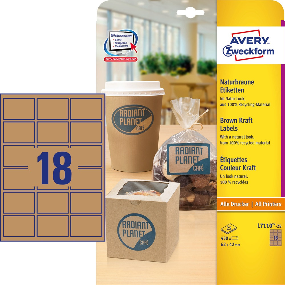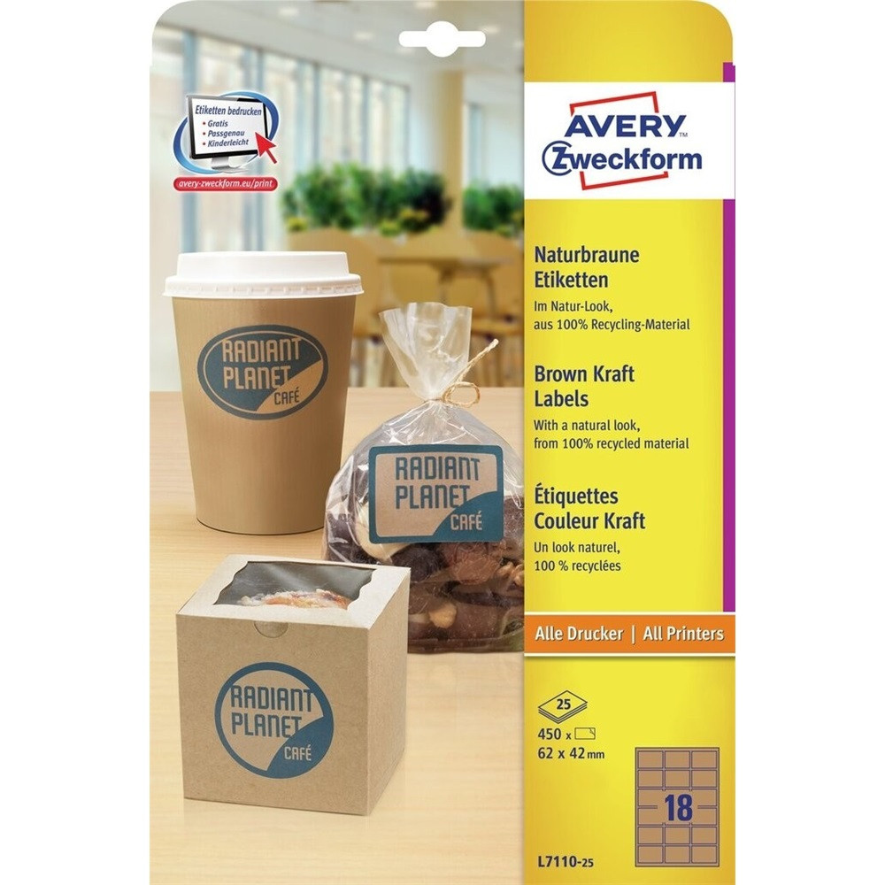 A barna nátron címke természetes hatást keltő termékcímkék, mely széltől szélig nyomtatható. A környezetbarát címkék 100% újrahasznosított alapanyagból készülnek. Tervezze meg és nyomtassa ki címkéit gyorsan és egyszerűen - ingyenes szoftverünkért és sablonjainkért látogasson el a http://www.avery.hu/templates-software/ weboldalra vagy használja a Microsoft® Office csomagokba beépített sablonjainkat! Bármely hagyományos nyomtatóval nyomtatható.