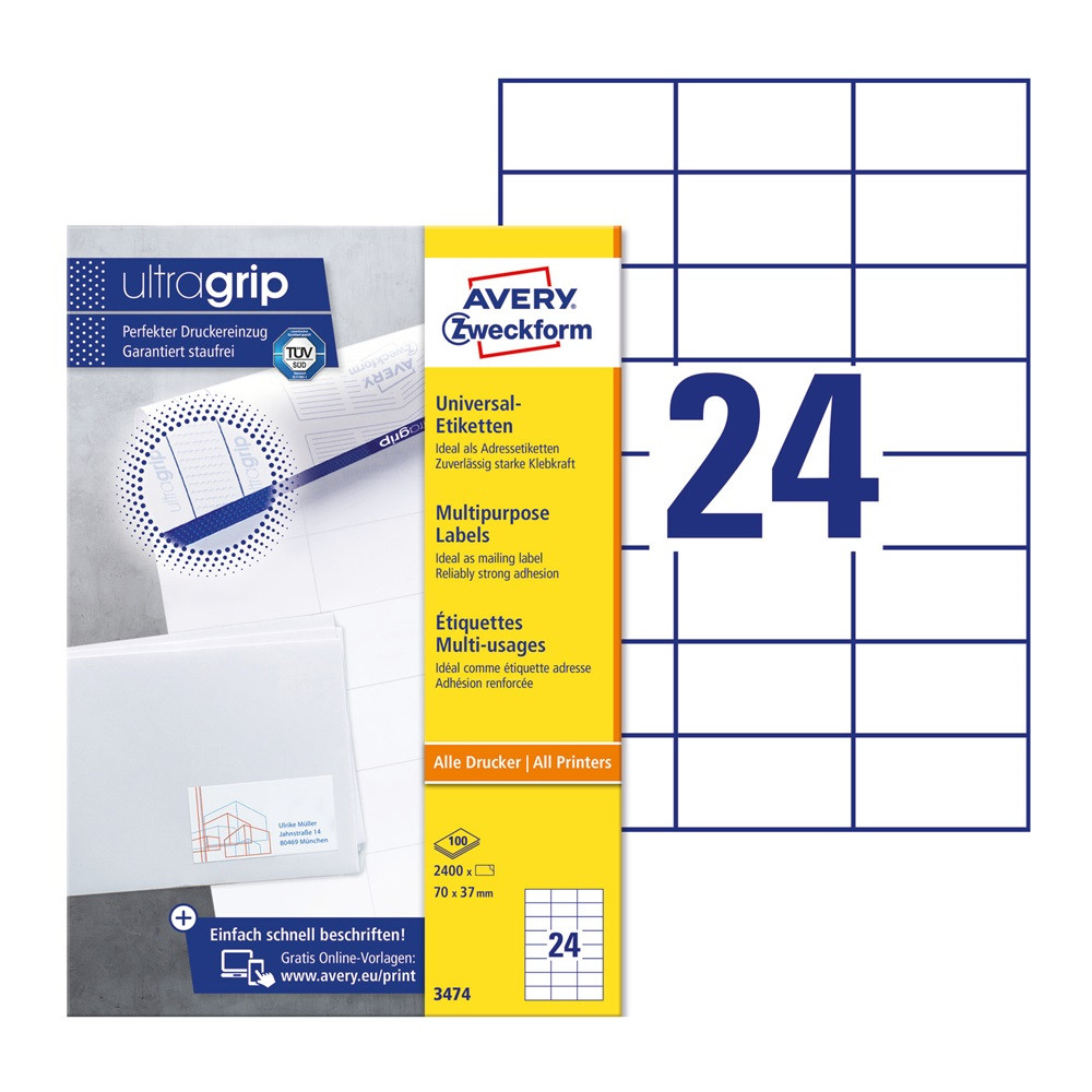 Etikett címke, 70 x37mm, univerzális, 24 címke/ív, 100 ív/doboz, Avery fehér