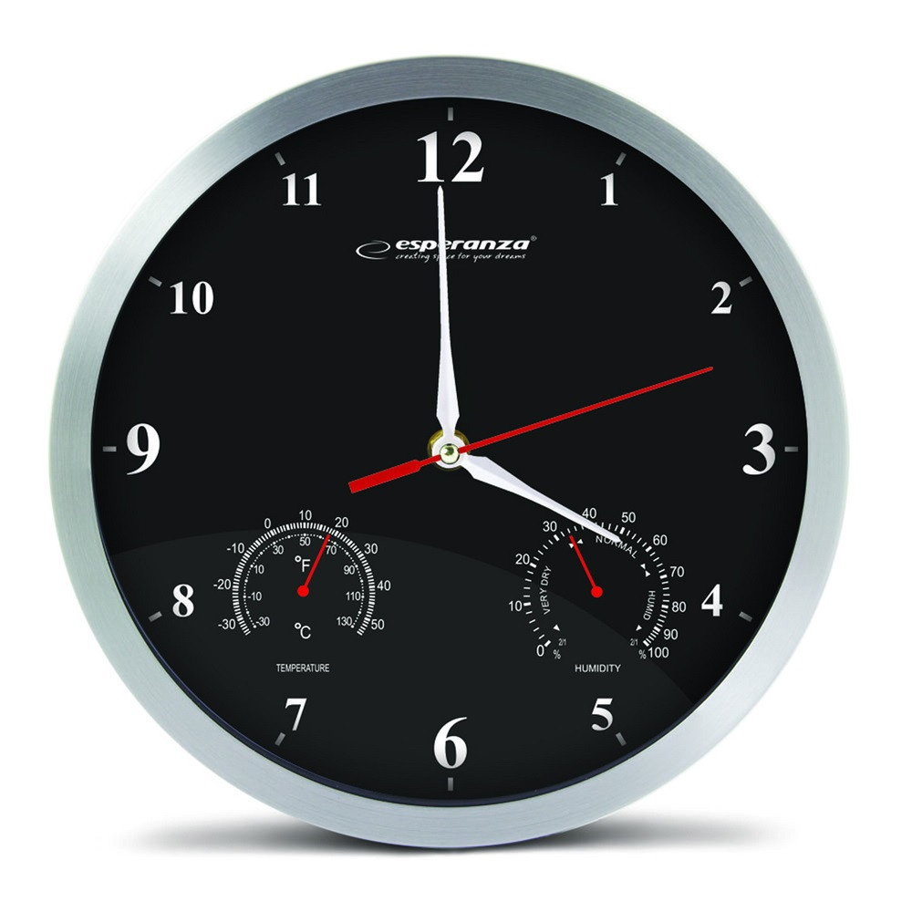 Ez az óra nem csak pontos időt mutatja, hanem a szobahőmérsékletet és páratartalmat. A rendkívül elegáns és stílusos kialakításnak köszönhetően kiválóan illeszkedik a lakások, irodákat, üzleteket és éttermeket berendezéseihez. A nagyméretű tárcsa lehetővé teszi, hogy az idősebb személy számára is könnyedén látható legyen a pontos időt, bárhol a helyiségben. Átmérő: 30 cm, Vastagság: 4 cm, Anyag: Alumínium keret, Óra tárcsa lemez: művészeti papír, Tápegység: 1x AA elem (nem tartozék), Csendes mechanikus mozgás - sima működés, Extrém pontos mechanikus mozgás: kvarc, Beágyazott horog a könnyű telepítéshez, Mérések: hőmérséklet és páratartalom, Mérési hőmérséklet tartomány: -30 C ~ + 50 C Celsius , -30 ° F ~ 110 F (Fahrenheit fok), Páratartalom mérési tartomány: 0 ~ 100% 1 év garancia Gyártó: Esperanza Szélesség cm: 31,6 Hosszúság cm: 4,6 Magasság cm: 31,5 Katalóguskód: 28504