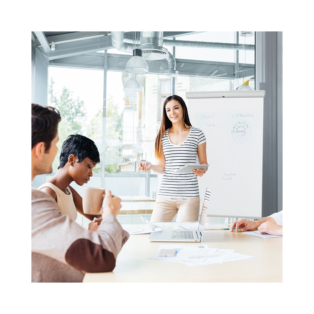 A prezentációk alapvető kelléke a flipchart tábla. Mágnesezhető felületű, markerrel írható, szárazon törölhető és bármilyen méretű, lyukasztású flipchart papírral használható tábla. A táblák tolltartó tálcával felszerelve. A flipchart táblák magassága tetszés szerint állítható (188 cm), iskolás gyerekek számára is könnyen hozzáférhető. Katalóguskód: 30726