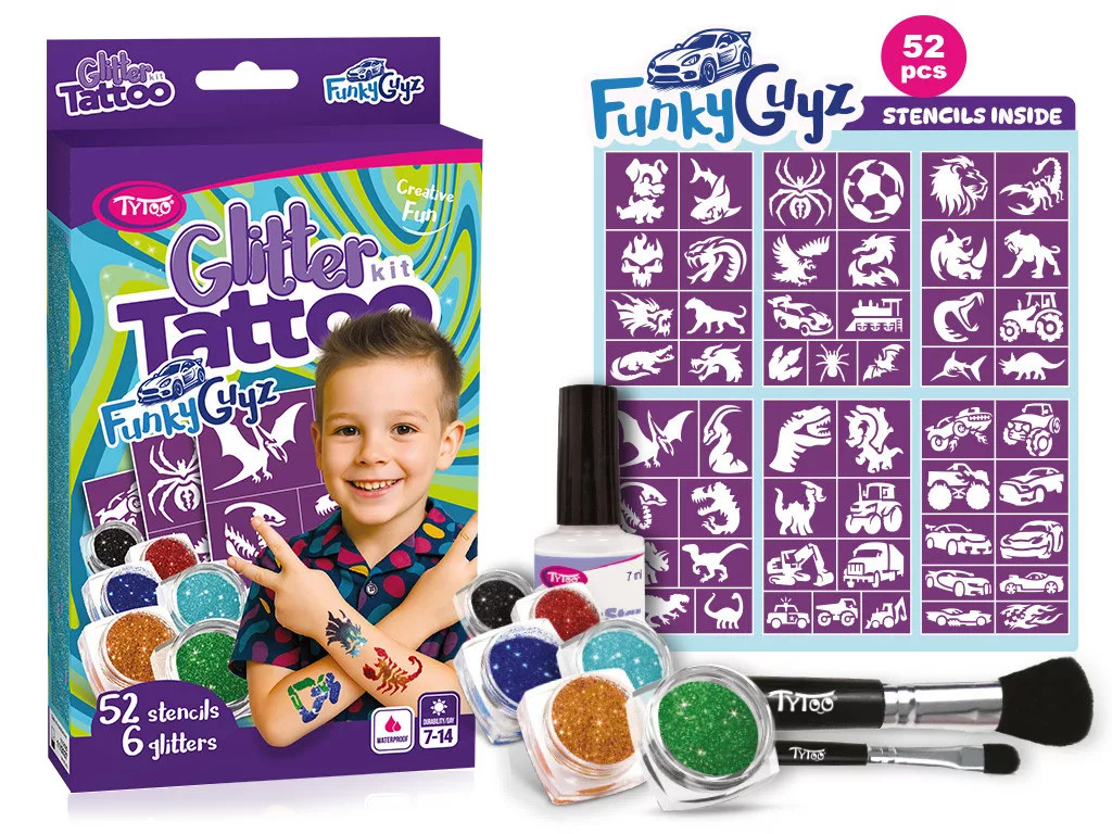 A FunkyGuyz tökéletes választás, ha nagy csillámtetoválás szettet, dinós csillámtetkó készletet, autós glitter tetoválás szettet, vagy komplett gyerek csillámtetoválás készletet bulira keresel. A 52 sablonos, bővített tartalom hosszabb ideig elegendő, és változatos mintakínálatot biztosít.