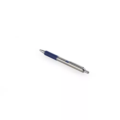 A metál család markáns megjelenésű, kiváló minőségű golyóstolla, rozsdamentes acél testtel. Kék gumírozott markolata kényelmes írást tesz lehetővé. Írás színe kék. Írásvastagság: 0,24 mm. Betét: F (kék, fekete, piros). Katalóguskód: 824