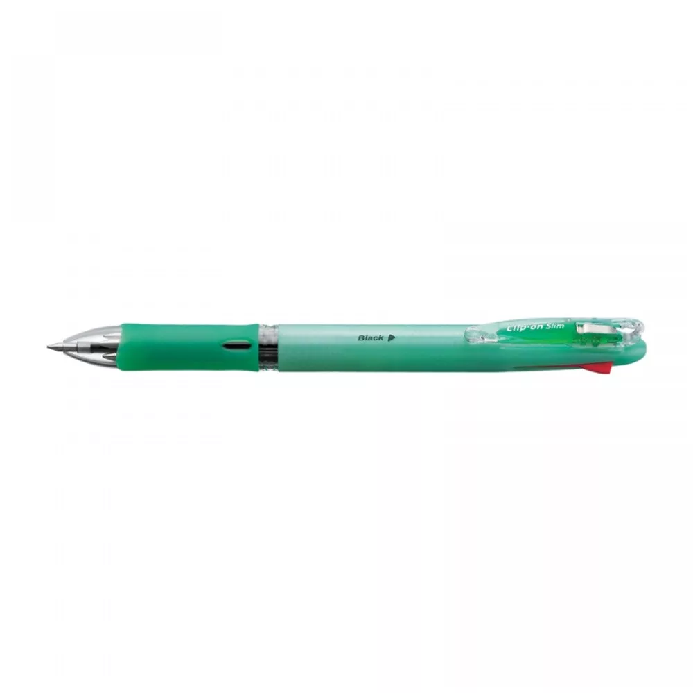 Négy funkciós golyóstoll, de a toll teste mégis vékony, gumírozott fogórész, csipeszes klipsz , alapanyagának 74%-a újrahasznosított anyagokból származik. Írás színe  kék+piros+fekete+zöld. Betét  SK.10db/gyűjtő, 1000db/karton, Katalóguskód: 798