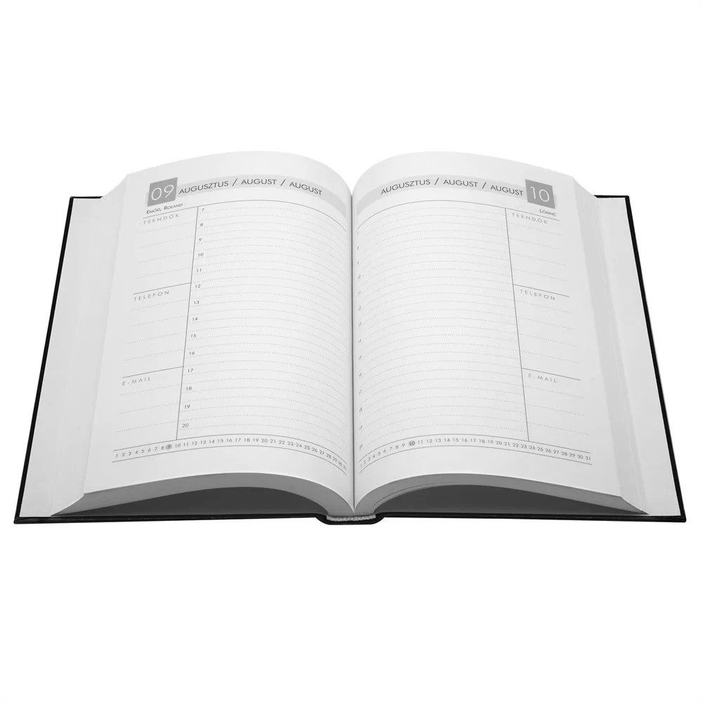 Keményfedeles papír alapú műbőr borítás. Napi beosztású Extrák: jegyzetlapok Beosztás Napi, BiancoFormátum A/5Papír FehérSzínek Vegyes színekMéret 15*21 cmKatalóguskód: 35951