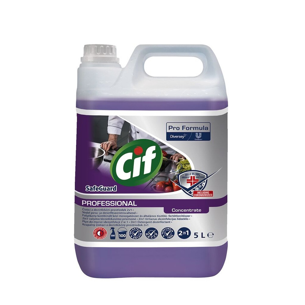 A Cif Pro Formula SafeGuard 2 az 1-ben Cleaner Disinfectant egy erősen koncentrált tisztító- és fertőtlenítőszer minden kemény felület egy lépésben történő tisztítására és fertőtlenítésére, beleértve az élelmiszerrel érintkező felületeket is. Nagyon hatékony a mikroorganizmusok széles köre ellen. Minden vízkeménység esetén ajánlott. Hatékonyan eltávolítja a zsíros és a rászáradt élelmiszer-szennyeződéseket.
