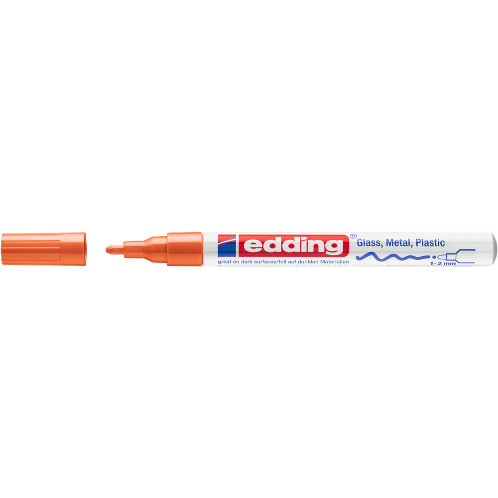 Üveg, porcelán, műanyag, fém illetve szinte minden felület feliratozására, jelölésére alkalmas, különösen ajánlott szennyezett felületekhez, lakk- és dekorációs fémtestű marker. Kerekített csúcs, fémtest, permanent, lakkszerűen fedő festékkel töltve. Gyorsan száradó festék, írásképe törlés- és vízálló, magas fény- hő- és törlésálló. Festékadagolása egyenletes, szelep vezérli, pótcsúcsolható (EDDDING 751 N írócsúcs). Vonalvastagság: 1-2 mm. 10db/dob Katalóguskód: 1245