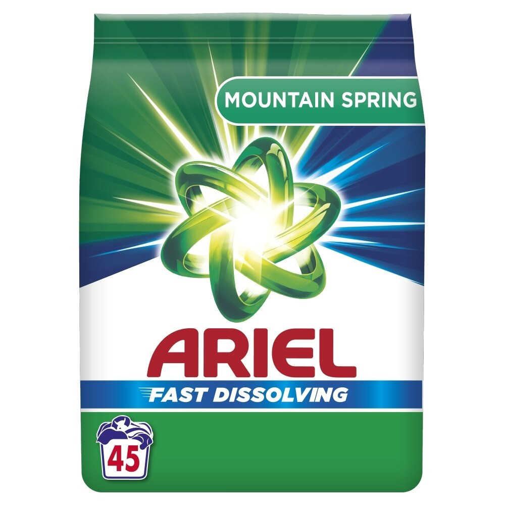 Ariel Mountain Spring mosópor: az Anti-residue technológiának köszönhetően az Ariel alacsonyabb hőfokú mosóprogramoknál is ragyogó tisztaságot eredményez.
