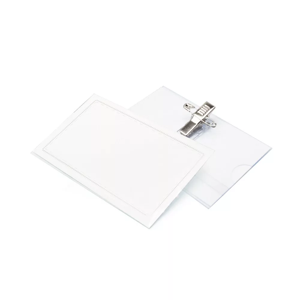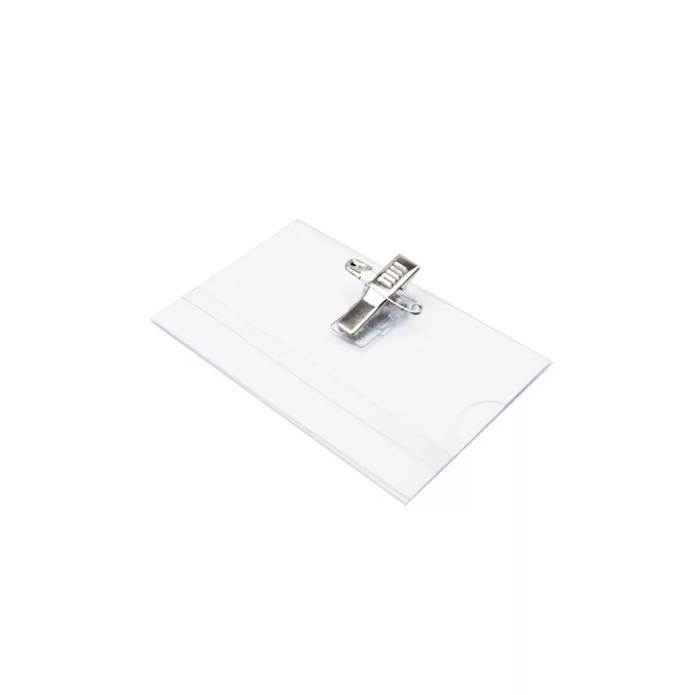 "Víztiszta, kemény PVC-ből készült névjegykártyatartó. Az oldalán nyitott, így a névjegykártyák könnyen kivehető. Üres névjegykártya lapok. Biztosító tűvel és csíptetővel ellátott kivitel. " 50db/doboz, 90x56 mm, 25MIC Katalóguskód: 18856