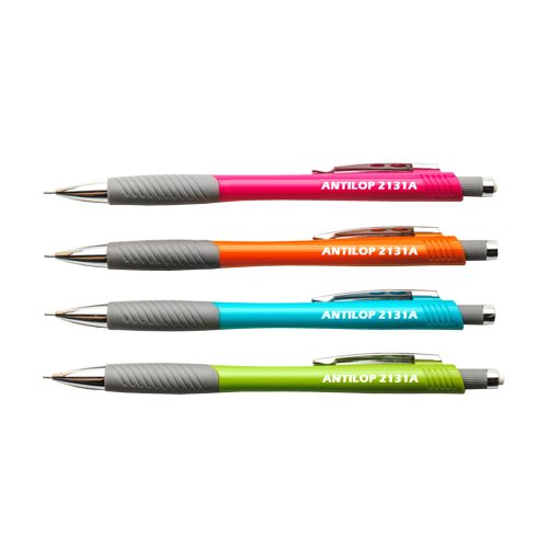 Antilop 2131A műanyag testű, nyomógombos mechanikus ceruza, recézett és gumírozott fogórésszel, fém clippel.Vegyes színek, mely nem választható: neon piros, kék, narancs, zöld. A grafit betét mérete: 0,5 mm. Kiszerelés: 12 db/doboz Katalóguskód: 1440