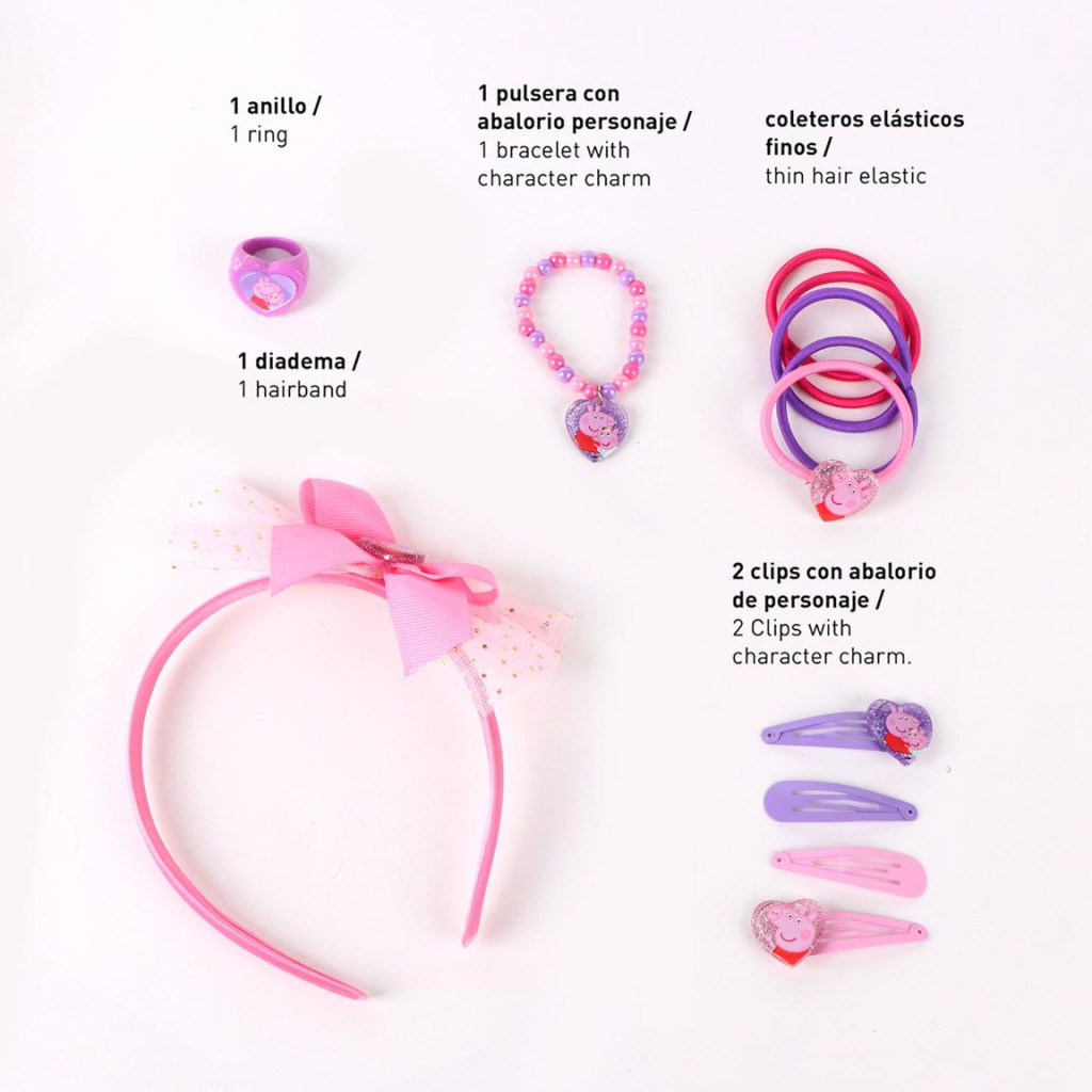 Peppa Pig, Peppa malac hajkiegészítő szett Méret: 21x29 Tartalma: - 1 db hajpánt - 4 db hajcsat - 5 db hajgumi - 1 db karkötő - 1 db gyűrű