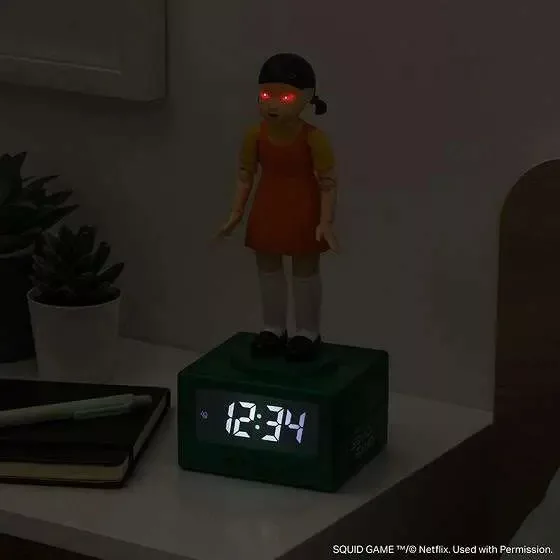 A Squid Game Young-Hee digitális ébresztőóra igazán különleges darab a népszerű sorozat rajongóinak. A jól ismert „Red Light, Green Light” jelenet ikonikus babája jelenik meg a dizájnban, amely garantáltan egyedi hangulatot teremt a szobában.