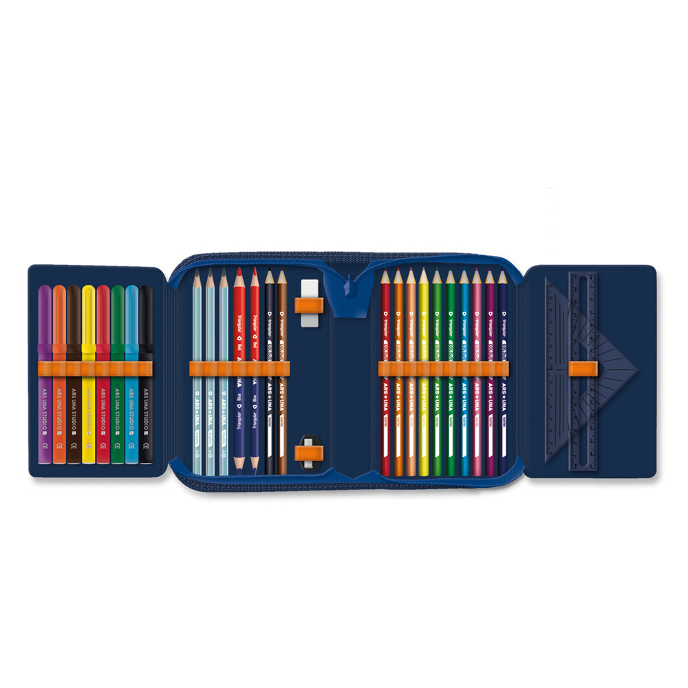Írószerekkel töltött cipzáros tolltartó két kihajtható füllel, gumis kialakítással az írószerek tárolásához. Tartalma: 12 db színes ceruza, 3 db HB grafit ceruza, 1 vékony és 1 vastag postairón, 8 db színes filctoll, 1 db radír, 1 db hegyező, 1 db 17 cm-es egyenes vonalzó, 1 db háromszög vonalzó, órarend A és B hétre. Hiteles tájékoztatás: Elkötelezettek vagyunk termékeink biztonságának garantálásáért, nyomon követjük a termékbiztonsággal kapcsolatos valamennyi európai uniós és hazai szabályozást és biztosítjuk termékeink azoknak történő megfelelését. Az EU 2023/988-as számú Általános Termékbiztonsági Rendeletét (GPSR) is alkalmazzuk, így ha a termékeink biztonságát illetően fogyasztóként kérdése, észrevétele van, vagy esetleg balesetről van tudomása, kérjük, írja meg nekünk. GPSR: Ars Una Studio Kft., H-1113 Budapest, Csetneki u. 13.,webshop@arsuna.hu, https://arsuna.hu/