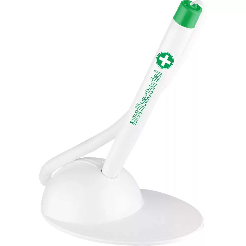 Antibakteriális ügyféltoll. A műanyag alkatrészek antibakteriális védelmet adó Biomaster ezüst-ionokat tartalmaznak ( hatóanyag: ezüst-foszfát ). Az ICO Antibakteriális termékei bizonyítottan baktériumölő tulajdonsággal rendelkeznek, a felszínen megtelepedett kórokozók 24 óra leforgása alatt, 99,9% hatékonysággal elpusztulnak. Az antibakteriális hatást az angliai Industrial Microbiological Services Ltd. bevizsgálta és igazolta. Regisztrációs szám: 3264423. Ragasztással rögzíthető talp. Vonalvastagság: 0,8 mm. Íráshossz: 2500 mm. Cserélhető betét: X-20.Katalóguskód: 1802