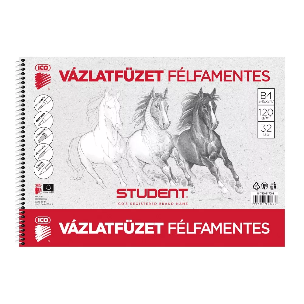 Félfamentes vázlatfüzet. 32 lap, spirálozott kivitel, grafikák, rajzok, vázlatokkészítéséhez. 120 g/m2-es lapokkal. Katalóguskód: 25422