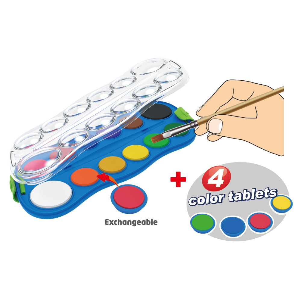 VÍZFESTÉK KÉSZLET, 12+4 CSERÉLHETŐ SZÍNNEL, ECSETTEL, MŰANYAG DOBOZBAN, KEYROAD