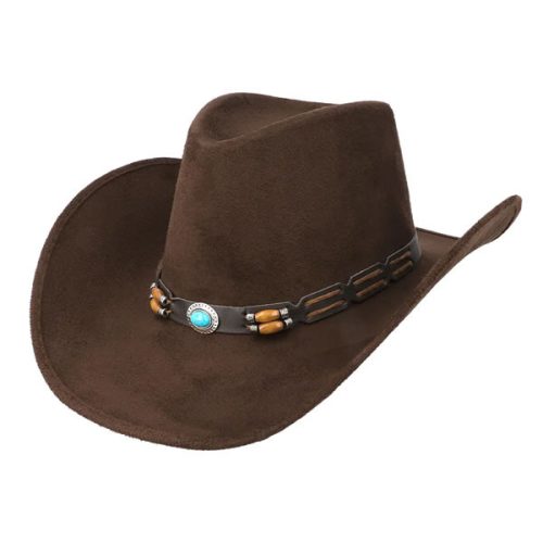 A velúr hatású anyag luxus megjelenést kölcsönöz a western kalapnak, míg a gyöngyökkel és türkiz kövekkel díszített bőr szalag rusztikus cowboy hangulatot kölcsönöz.