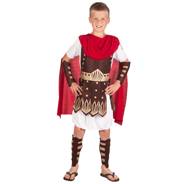A csomag tartalmaz egy stílusos tunikát, ami páncélzattal és köpennyel van ellátva, valamint lábvédőket és karvédőket is, így a kis gladiátor készen áll a harcra.