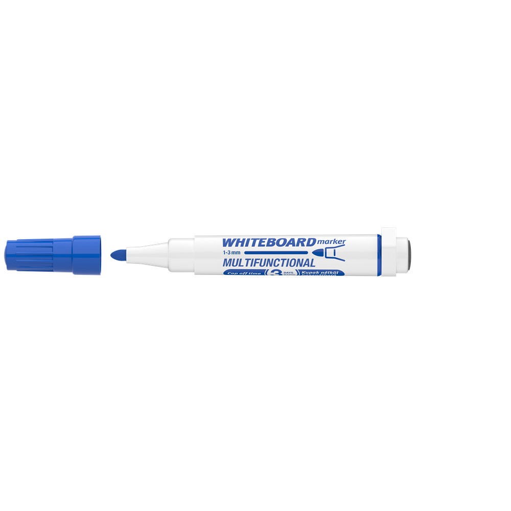 Multifunkciós táblamarker: - mágneses fehértáblára való írásra, rajzolásra. - speciális festékanyagának köszönhetően, néhány napig, kupak nélkül sem szárad be. -a kupakban elhelyezett mágnes révén, acél táblafelületeken rögzíthető. - az írás szárazon letörölhető, melyet a kupak végén található táblatörlő korong is segít. Kerekített csúccsal. Vonalvastagság: 3 mm. Katalóguskód: 19364