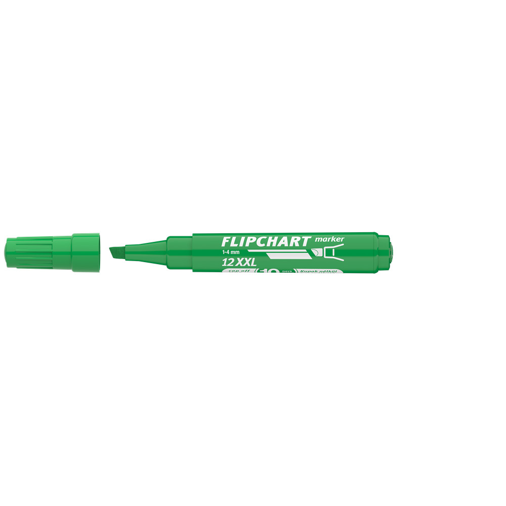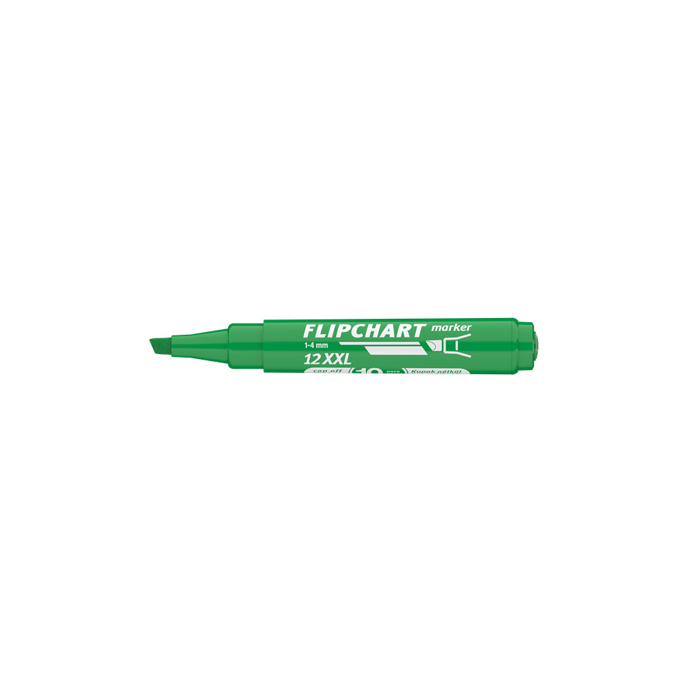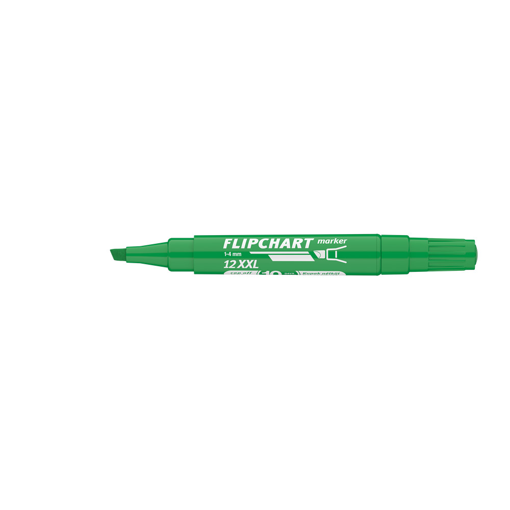 Flipchart tömbök és egyéb papírívek feliratozására alkalmas, vízbázisú festékkel töltött marker. A festék a papír másik oldalára nem üt át. Megnövelt élettartam a nagyobb méretű testnek köszönhetően. Vágott csúccsal. Vonalvastagság: 1-4 mm.Katalóguskód: 19138