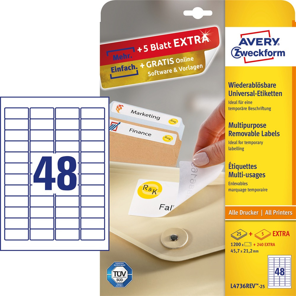 Címke mérete: 45,7 x 21,2 mm Doboz tartalma: 1200 + 240 extra darab címke - 25 + extra ív/ doboz (48 címke/lap) Tökéletesen alkalmas pl. fűszercímkéknek, stb. (1200 címke/csomag). A címkék megbízhatóan tapadnak, ugyanakkor ragasztómaradvány nélkül eltávolíthatóak a legtöbb felületről. Biztos lehet abban, hogy az ívek nem akadnak el nyomtatás közben és nem kerül ragasztómaradvány a nyomtatójába. A problémamentes nyomtatás a lézernyomtatók esetén a TÜV SÜD által bevizsgált és tanúsított. Az univerzális etikettek tökéletes címkézést, tűéles képeket, tökéletes toner tapadást és elkenődésmentes felületet garantálnak. Környezetbarát, FSC® minősített és klórmentes eljárással fehérített. Tervezze meg és nyomtassa ki címkéit gyorsan és egyszerűen - ingyenes szoftverünkért és sablonjainkért látogasson el a http://www.avery.hu/templates-software/ weboldalra vagy használja a Microsoft® Office csomagokba beépített sablonjainkat! Optimalizált minőség tintasugaras, lézer és színes lézer nyomtatókhoz, fénymásolókhoz. Katalóguskód: 25281