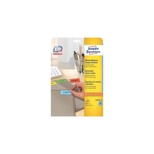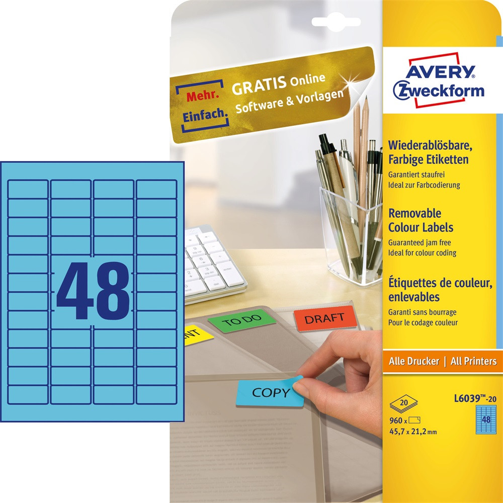 Etikett címke, 45,7 x21,2mm, univerzális visszaszedhető, 48 címke/ív, 20 ív/doboz, Avery kék