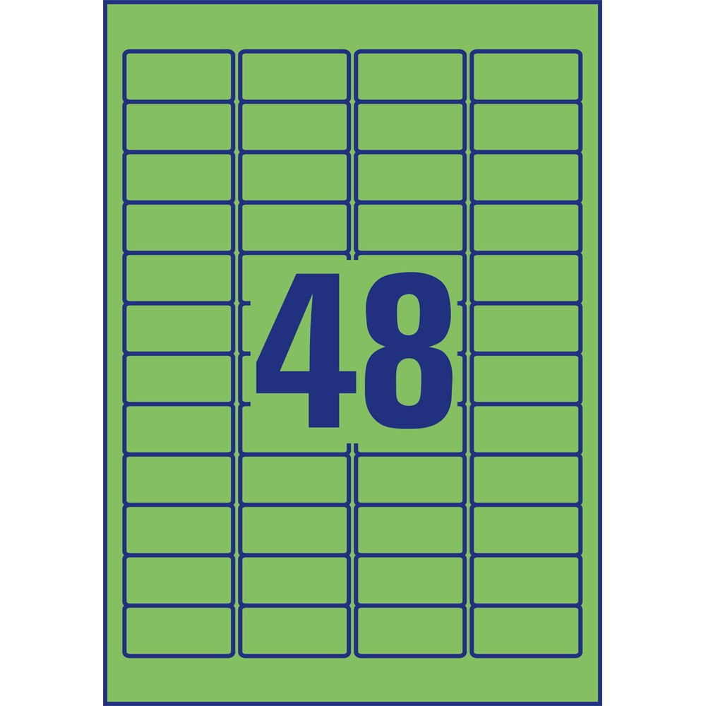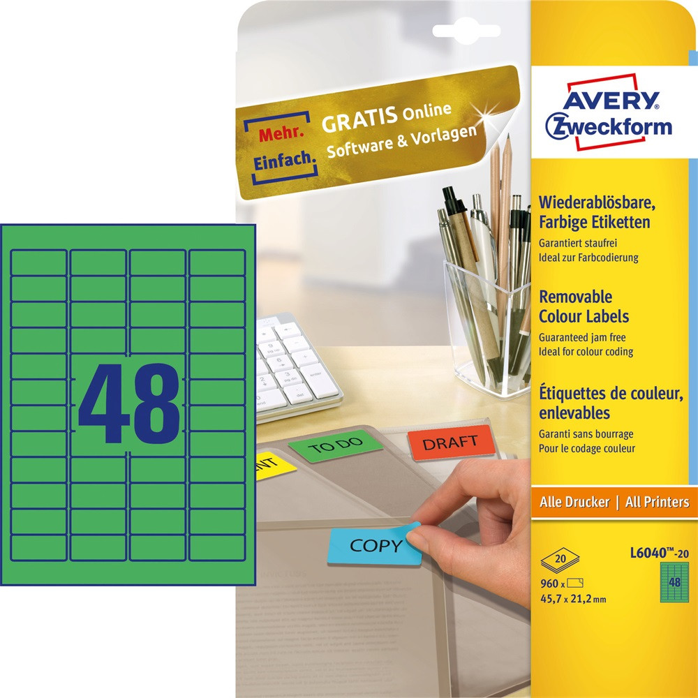 Etikett címke, 45,7 x21,2mm, univerzális visszaszedhető, 48 címke/ív, 20 ív/doboz, Avery zöld