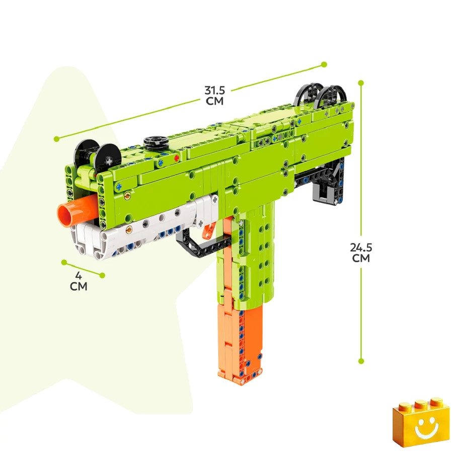 A QMAN® 52003 UZI SMG építőjáték egy működő pneumatikus mechanizmussal rendelkező modell, amely az UZI géppisztolyt ábrázolja. 398 darab technic építőelemet tartalmaz, és 8 éves kortól ajánlott.